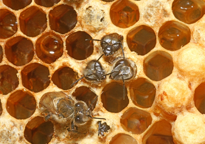 | Geburt von mehreren Arbeiterinnen. Während der Sommermonaten wenn das Bienenvolk sehr stark ist, kann man sehr oft beobachten das auf einer Wabe mehrere Honigbienen auf einmal schlüpfen und sich aus den Zellen befreien. | ||